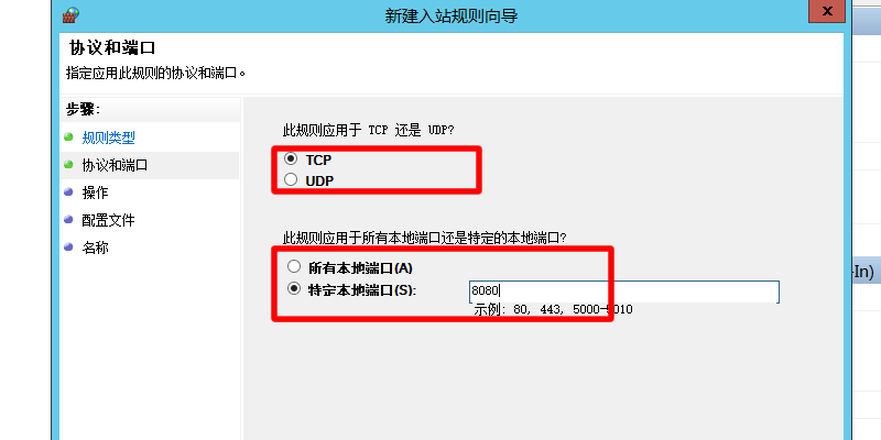 4、设置“TCP”、“特定本地端口”,并输入:8080(如安装tomcat时选用了其他端口,此处对应修改)