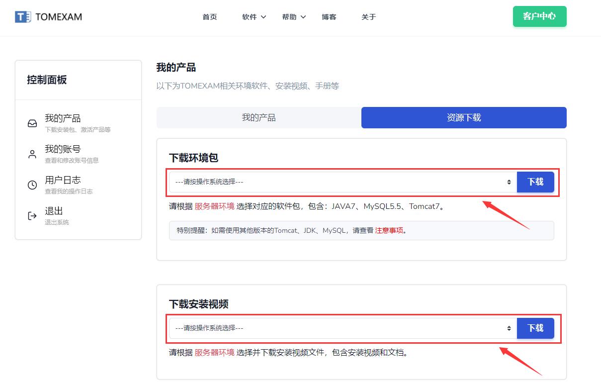 2、可在“资源下载”页面下载安装软件所需的 环境包(包含JAVA、MYSQL、Tomcat) 和 安装视频,如下图: