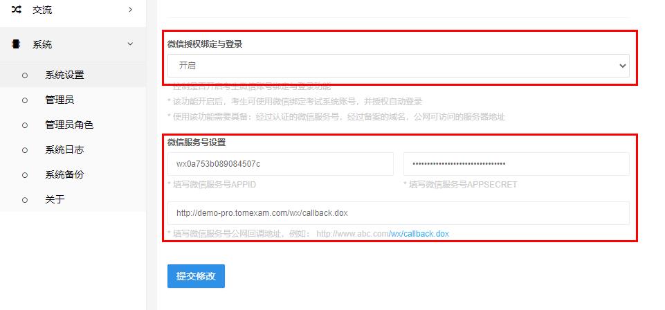 1、在 “系统设置” 中,开启 “微信授权绑定与登录” 功能,填写 “AppID” 、“AppSecret” 和 “回调地址” 参数: